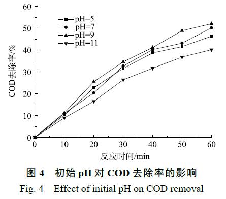 實驗選取了 4 個不同的 pH,用 NaOH 調(diào)節(jié)廢水 pH,臭氧催化氧化時間為 60 min,臭氧的投加量為 300 mg·L−1。由 圖 4 可知,初 始 pH 對臭氧催化氧化降 解COD 的影響較大,隨著 pH 的升高,COD 的去除率呈上升趨勢,當初始 pH 從 5 升到 9 時,COD 的去除率從 46.4% 升至 52.1%。臭氧間接氧化較多發(fā)生在中、堿性條件下,臭氧在堿性條件下很不穩(wěn)定,易促進其自身分解[18],可通過自發(fā)的一系列鏈式反應生成強氧化性的·OH[19],更有利于 COD 的去除。此外隨著廢水pH 的升高,水中 OH−濃度增加,加劇了臭氧分解產(chǎn)生·OH。