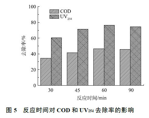 臭氧催化氧化實驗在室溫下進行,在廢水初始 pH 為 5,通過調(diào)節(jié)臭氧進氣濃度控制臭氧投加量為 300 mg·L−1 的條件下,考察了臭氧催化氧化時間對有機物去除效果的影響,結果如圖 5 所示。當反應時間從 30 min 增至 60 min 時,COD 和 UV254 的去除率分別從 34.6%、60.4% 升高到 46.4%、76.3%,有機物的去除率隨反應時間的延遲而增加。這是由于·OH 在水中的壽命很短 [22],大約 為 10−9  s,臭氧催化氧化中·OH 氧化反應實際發(fā)生在催化劑周圍,在傳質(zhì)不充分的反應條件下,部分·OH 在未知有機物發(fā)生反應之前就已經(jīng)被淬滅。當臭氧催化氧化時間縮短時,單位時間內(nèi)臭氧投加量加大,產(chǎn)生的·OH 增多,導致大量·OH 未參與反應就淬滅,從而導致有機物去除率下降。當反應時間到達一定的臨界點時,再延長反應時間,其去除率增加不再明顯,臭氧催化氧化反應從 60 min延長至 90 min 時,COD 和 UV254 的去除率基本不變。